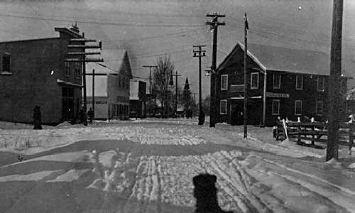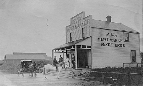 Showing the McKee Brothers' Delta Meat Market on Chisholm Street with the Delta Hotel behind it and the Marshall Smith store across the street